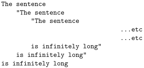But, such an attempt must fail, for to quote a finite sentence inside itself would mean that the sentence is smaller than itself. However, infinite sentences can be self-referenced this way.