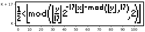 ({1 \over 2} < \left\lfloor \mathrm{mod}\left(\left\lfloor {y \over 17} \right\rfloor 2^{-17 \lfloor x \rfloor - \mathrm{mod}(\lfloor y\rfloor, 17)},2\right)\right\rfloor)